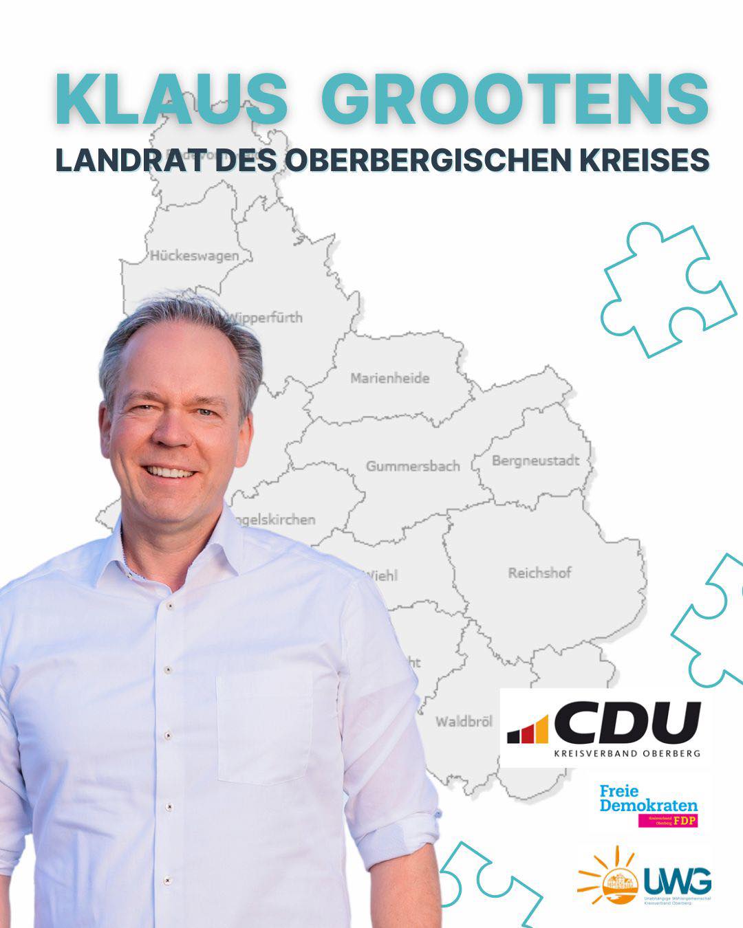 Am 28.09. haben wir es geschafft. Klaus Grootens wurde mit 61,72 % der Stimmen zum Landrat des Oberbergischen Kreises gewählt. Allen Wählerinnen und Wählern, aber auch allen Unterstützerinnen und Unterstützern ganz herzlichen Dank. Wir freuen uns mit Klaus Grootens die Zukunft des Oberbergischen Kreises gestalten zu dürfen.